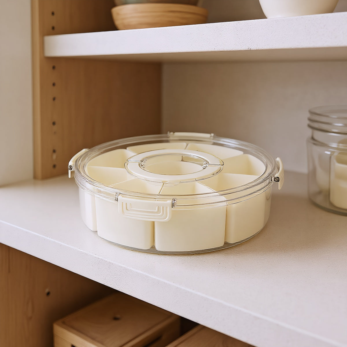 This snackle box features a 360° rotating base—just like a Lazy Susan—allowing you to easily access your favorite snacks with a simple spin. It includes 9 divided compartments to keep fruits, nuts, candies, or veggies neatly organized. The tightly sealed lid locks in freshness and keeps each section separated.