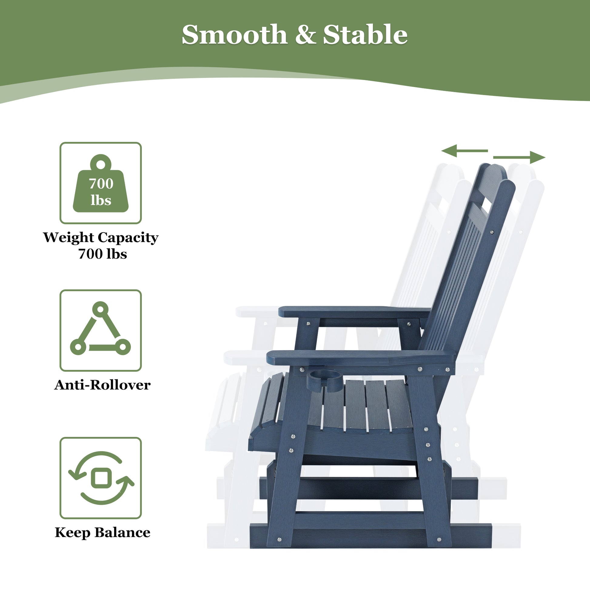 𝐃𝐮𝐫𝐚𝐛𝐥𝐞 & 𝐖𝐞𝐚𝐭𝐡𝐞𝐫-𝐑𝐞𝐬𝐢𝐬𝐭𝐚𝐧𝐭: Made from HIPS (High Impact Polystyrene), this glider offers exceptional weather and impact resistance, ensuring a much longer lifespan compared to wooden furniture. Also, it does not have the disadvantage of HDPE products, that the seat plate will sag due to the soft material. The 18/8 stainless steel screws and nuts ensure rust-free durability for long-lasting performance.