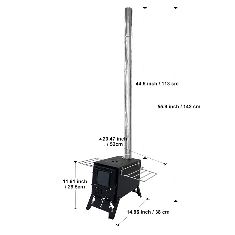 This portable folding wood-burning tent stove is designed for both heating and cooking during outdoor adventures. The collapsible legs and folding handles make it compact and easy to carry, while all accessories can be stored inside the furnace body for convenience. A large visible window lets you monitor the fire at any time, and the adjustable air vents provide better airflow control to maintain stable cooking temperatures.
