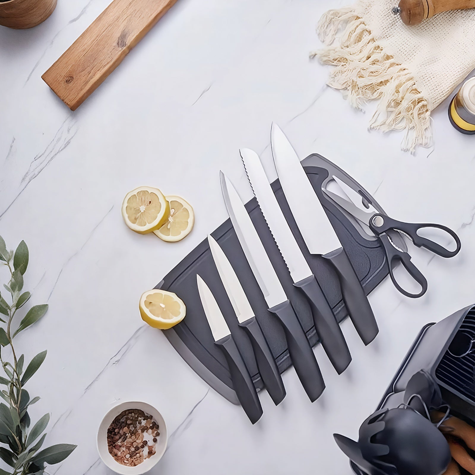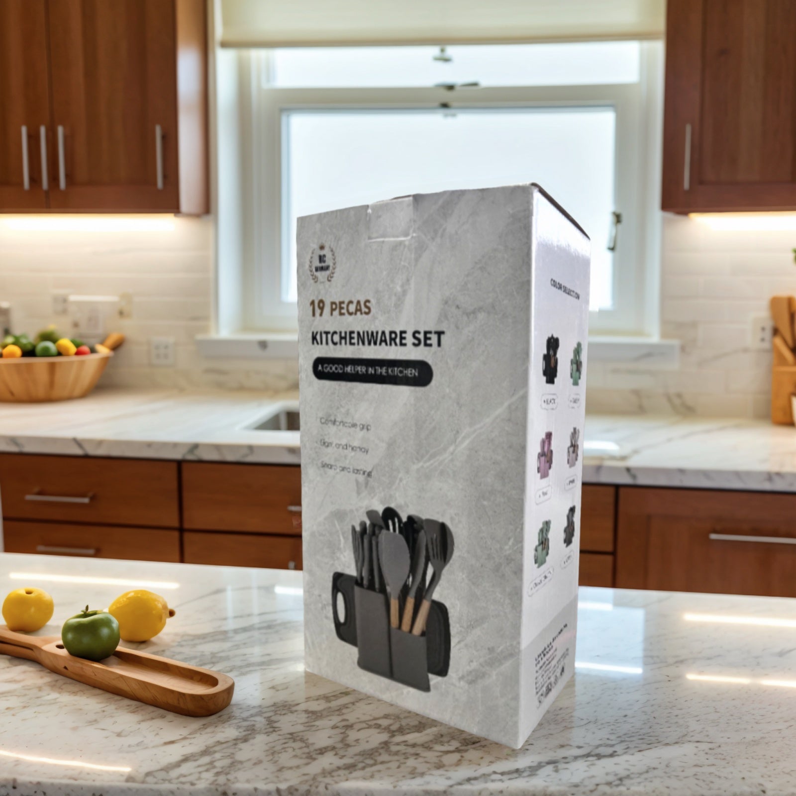 This 19 pcs kitchen utensil set includes heat-resistant silicone cooking tools, a complete knife set, cutting boards with a rack, and essential kitchen gadgets — everything you need for everyday cooking and meal preparation.