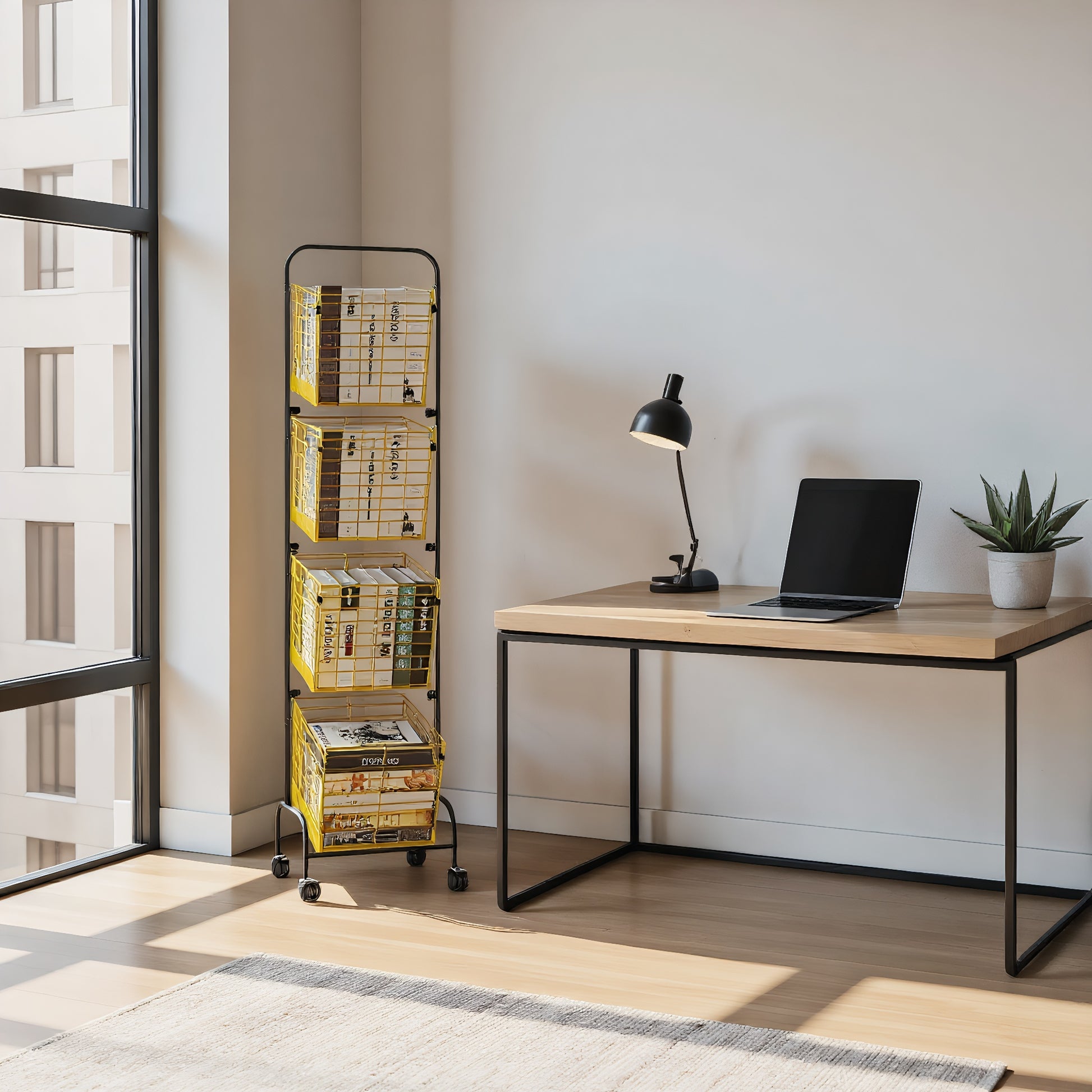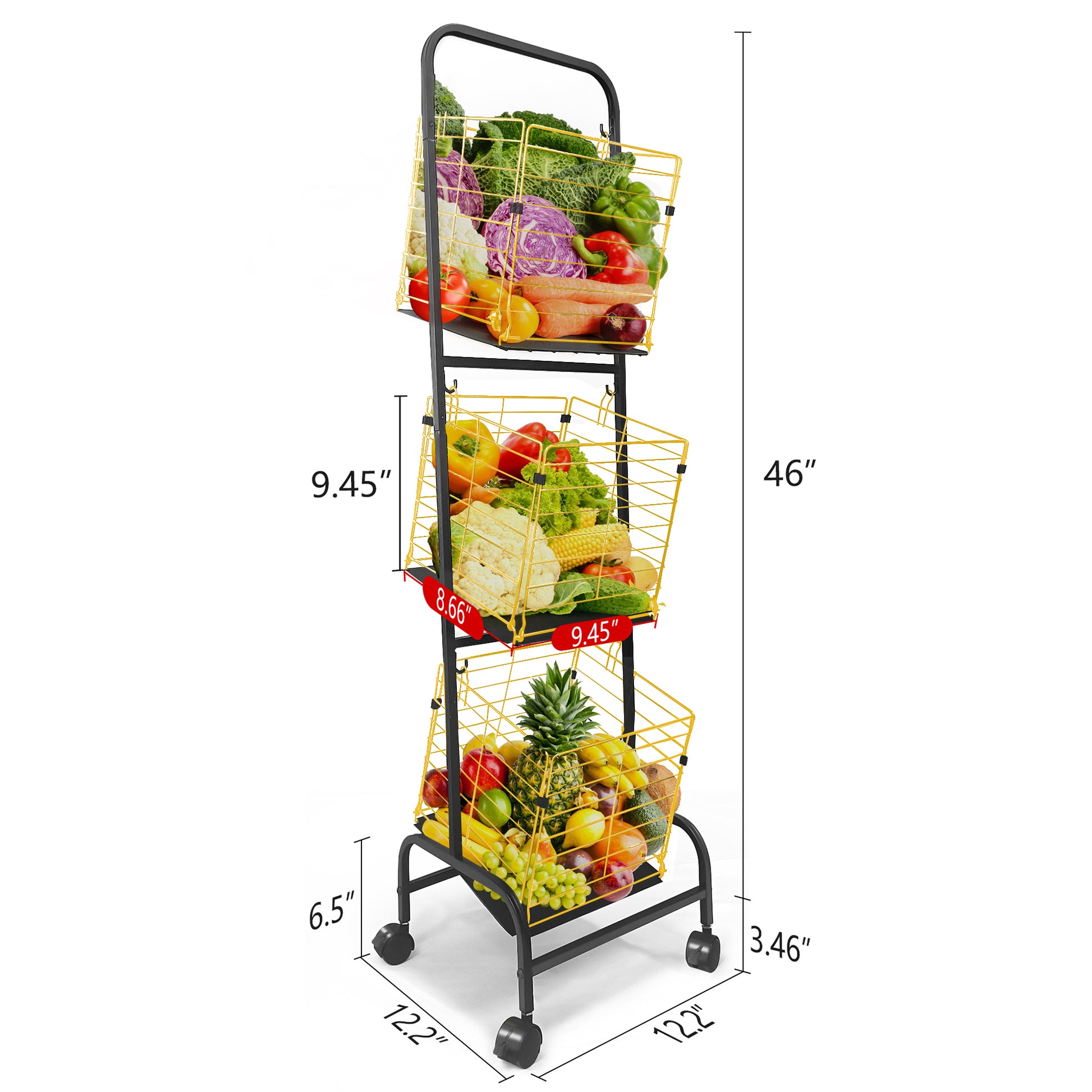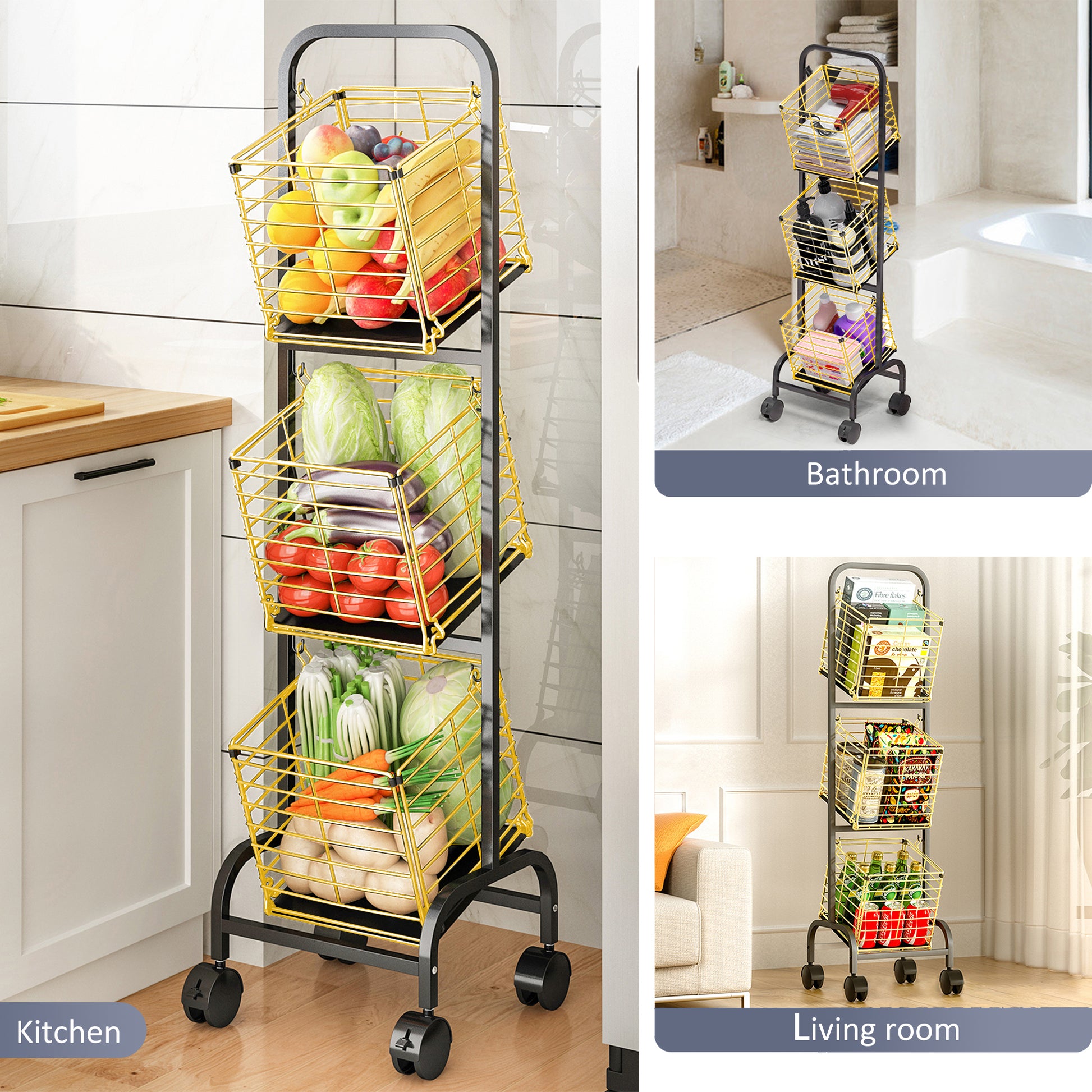 Fortune Candy 3-Tier Metal Rolling Storage Basket Cart, Black Gold Utility Organizer with Wheels for Books, Toys, Food, Vegetables, and More