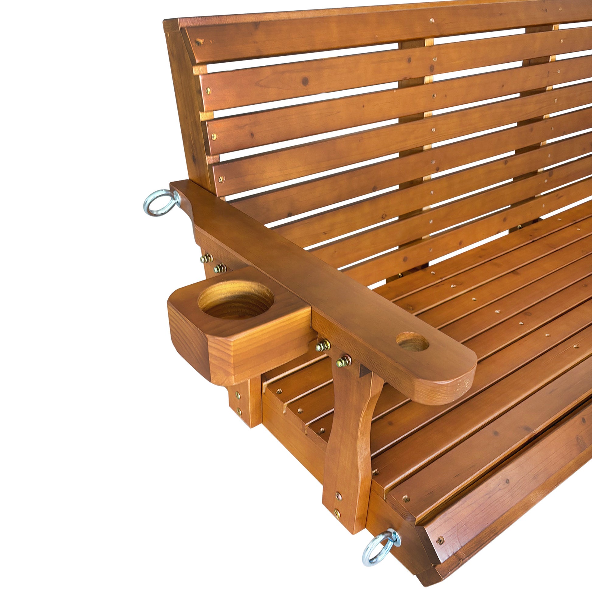 Experience outdoor relaxation at its finest with our 5-foot solid fir wood swing, expertly crafted and designed for both durability and comfort. Coated in premium PU wood paint, this swing is built to withstand rain, sun, and seasonal weather changes without cracking or peeling. Equipped with heavy-duty metal chains and spring hooks, it ensures secure hanging and a gentle, safe bounce. Dual built-in cup holders add convenience, so your drinks stay steady while you sway, read, or simply enjoy your porch, patio, or garden view. Assembly is straightforward—just attach the chains and hooks to a strong support, and your swing is ready for long-lasting outdoor enjoyment.