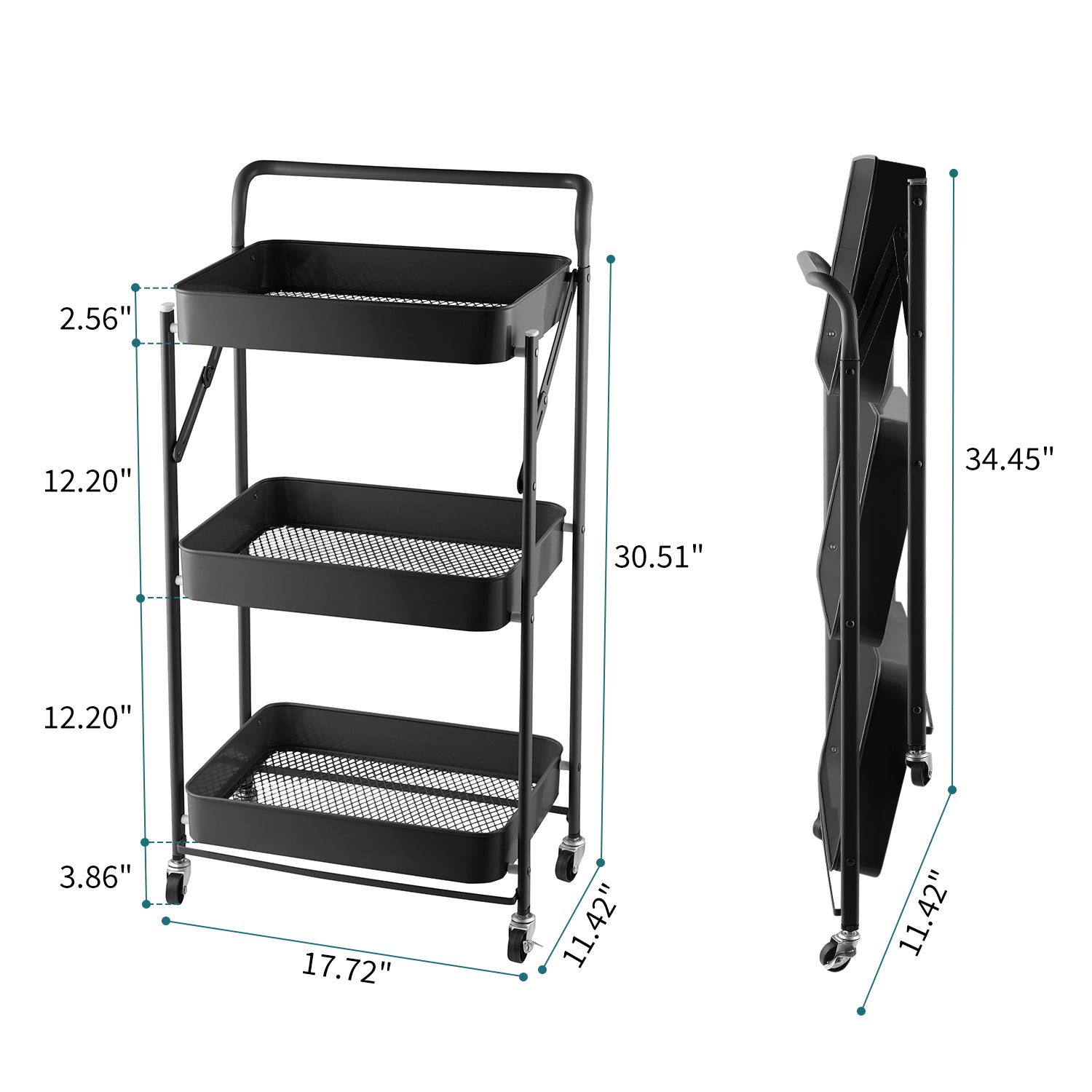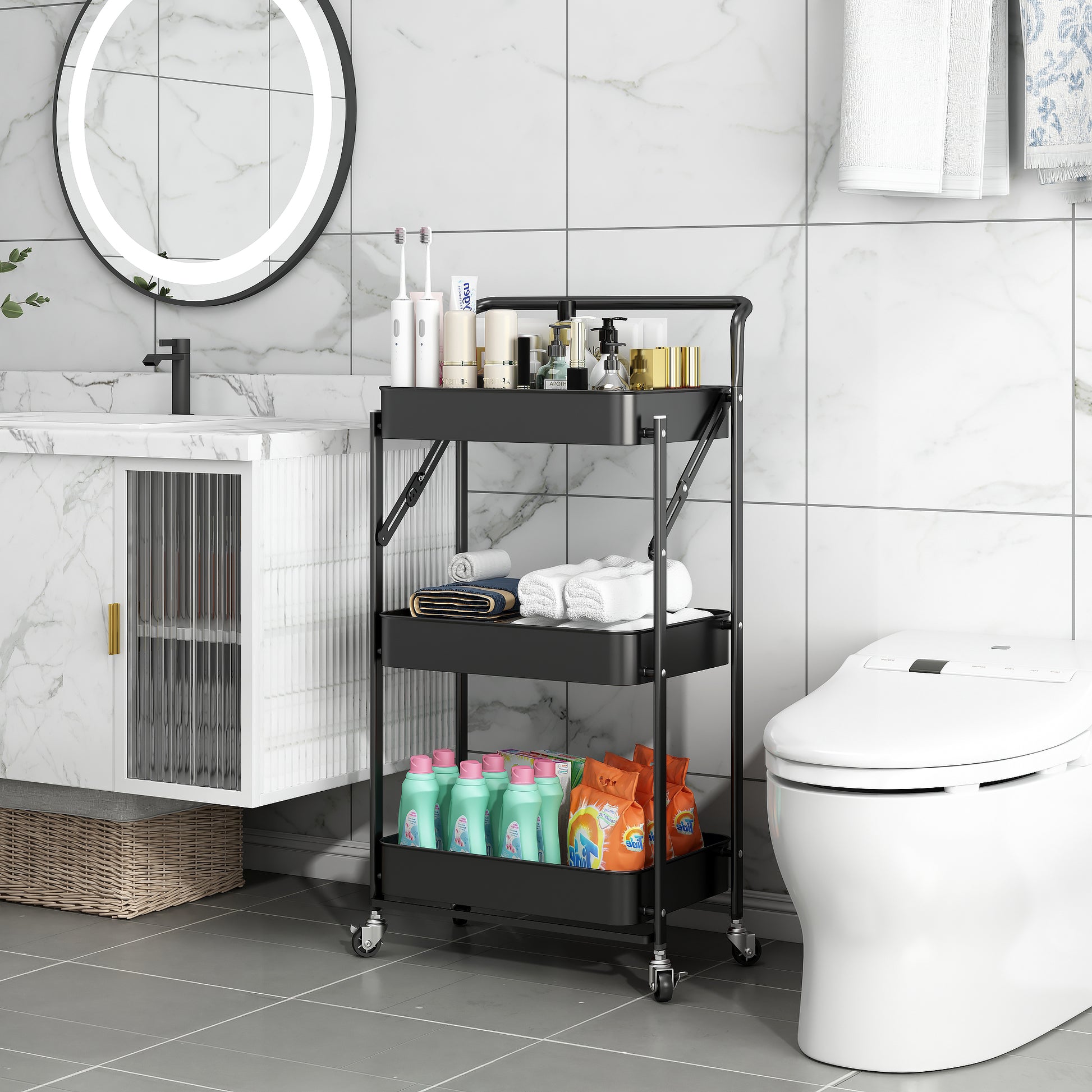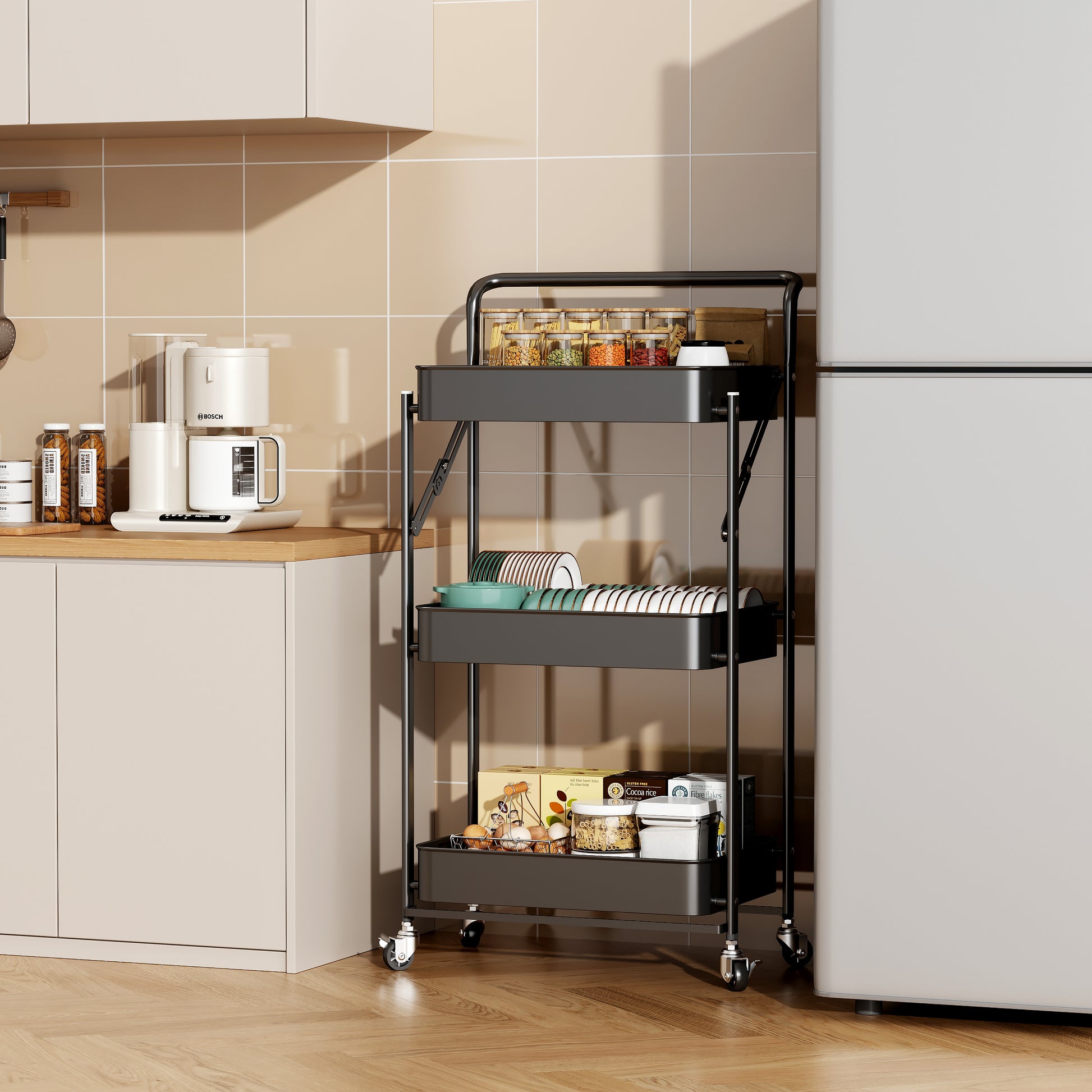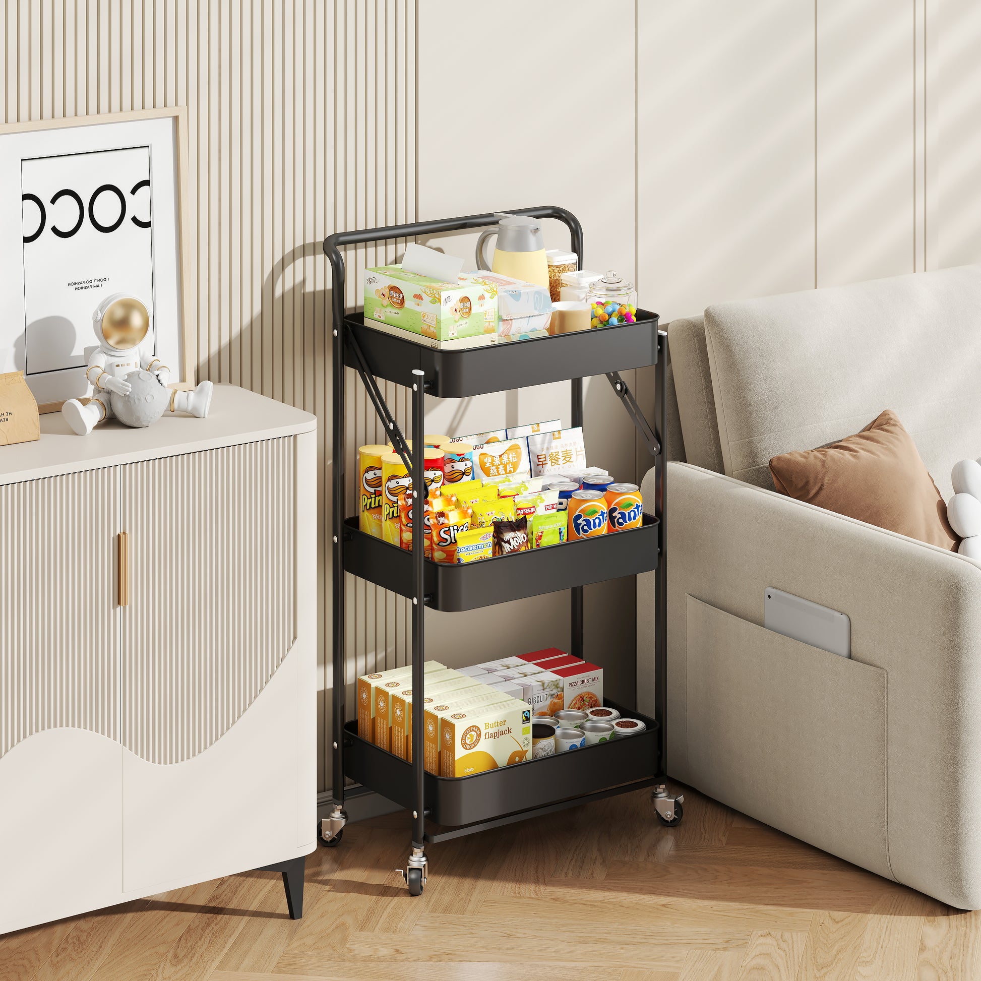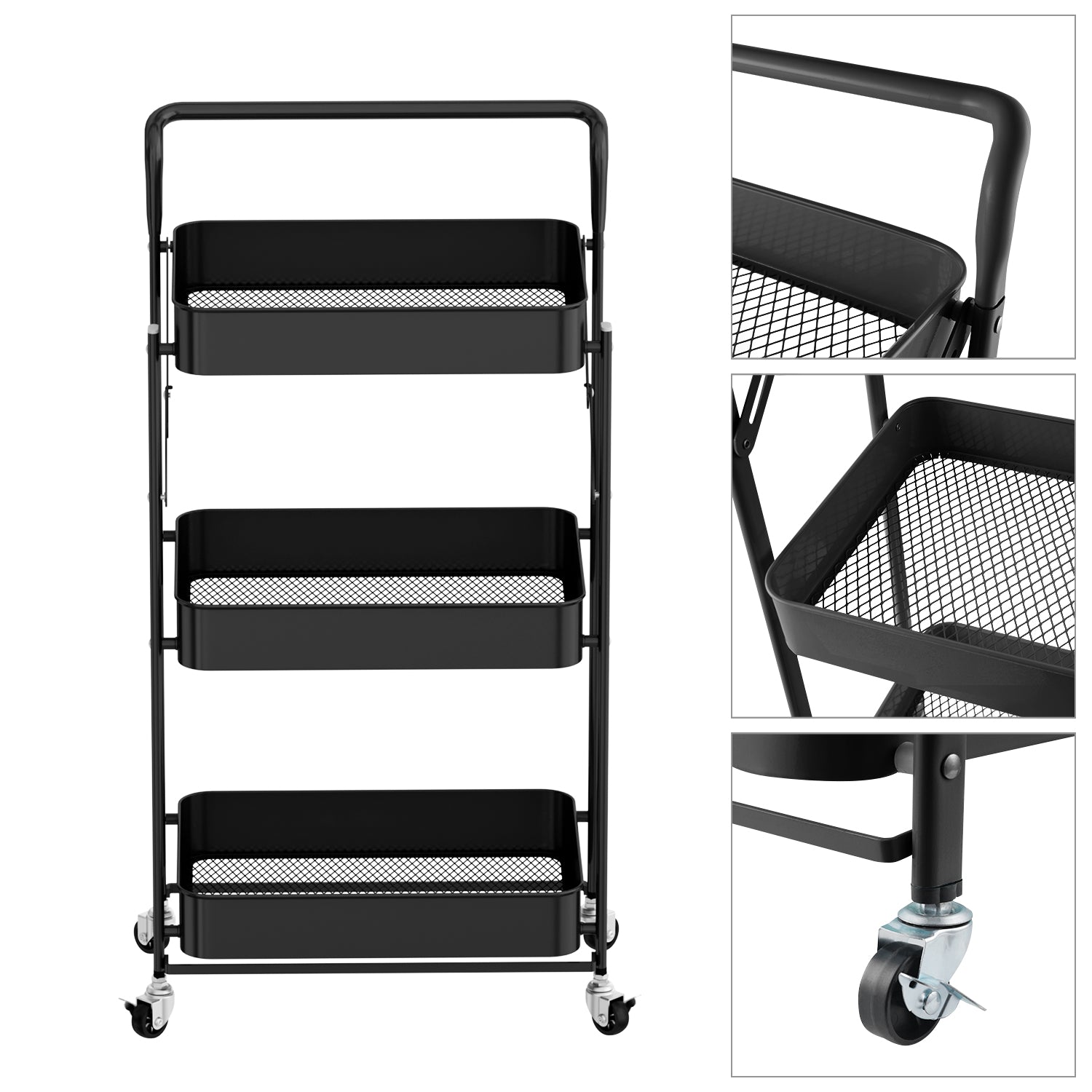 Fortune Candy Foldable 3-Tier Rolling Utility Cart, No-Assembly Multipurpose Storage Organizer with Handle for Home or Office, Black