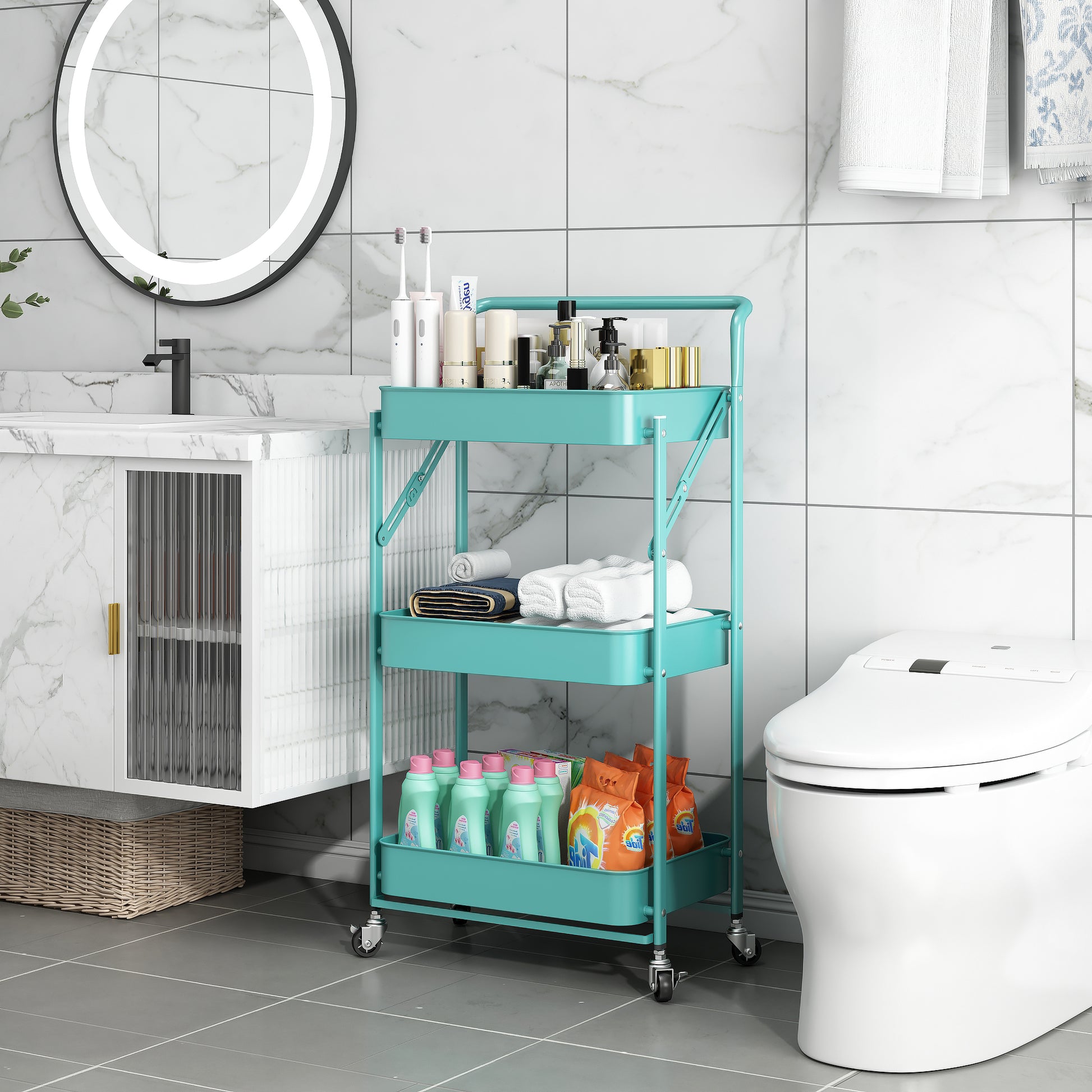 Fortune Candy Foldable 3-Tier Rolling Utility Cart, No-Assembly Multipurpose Storage Organizer with Handle for Home or Office, Green