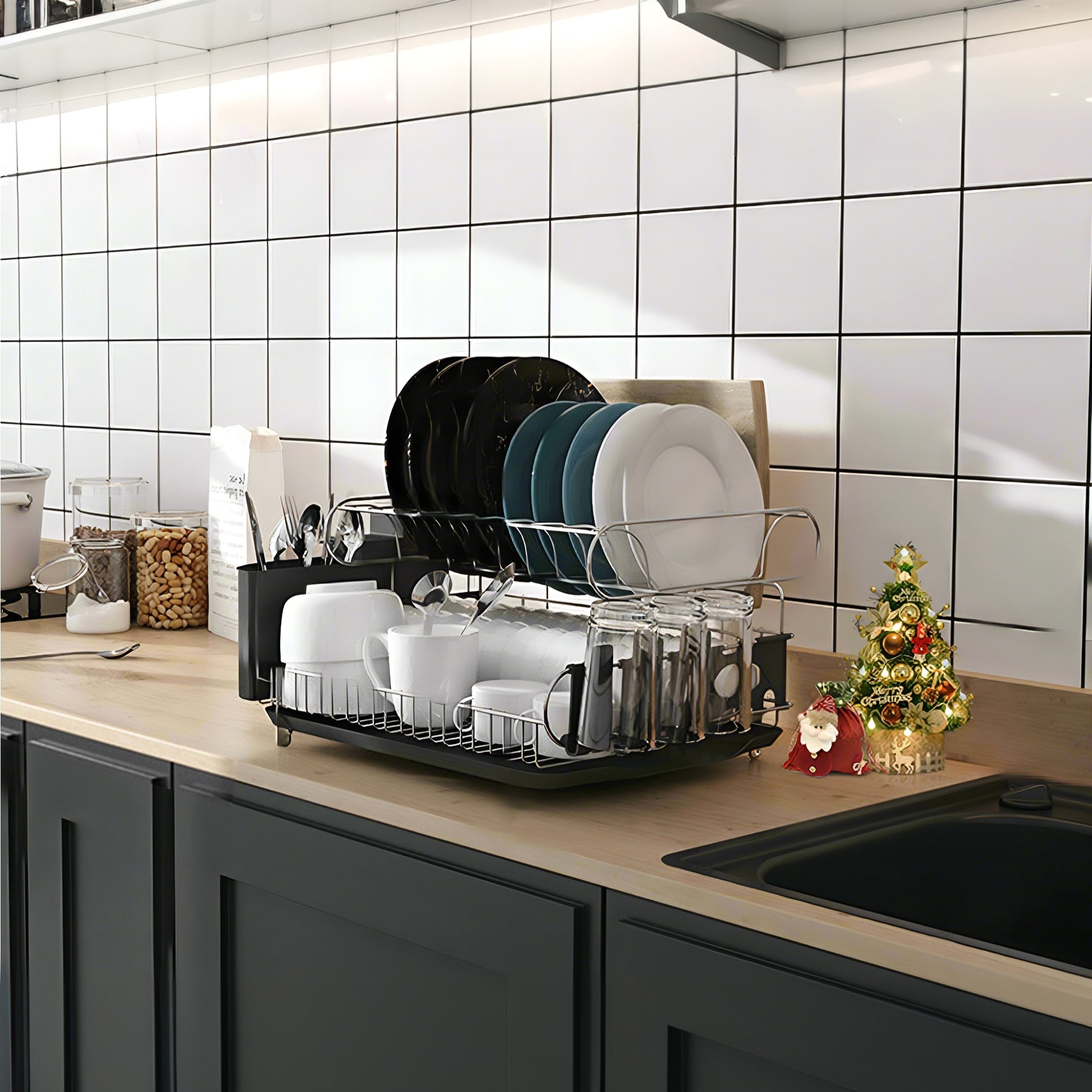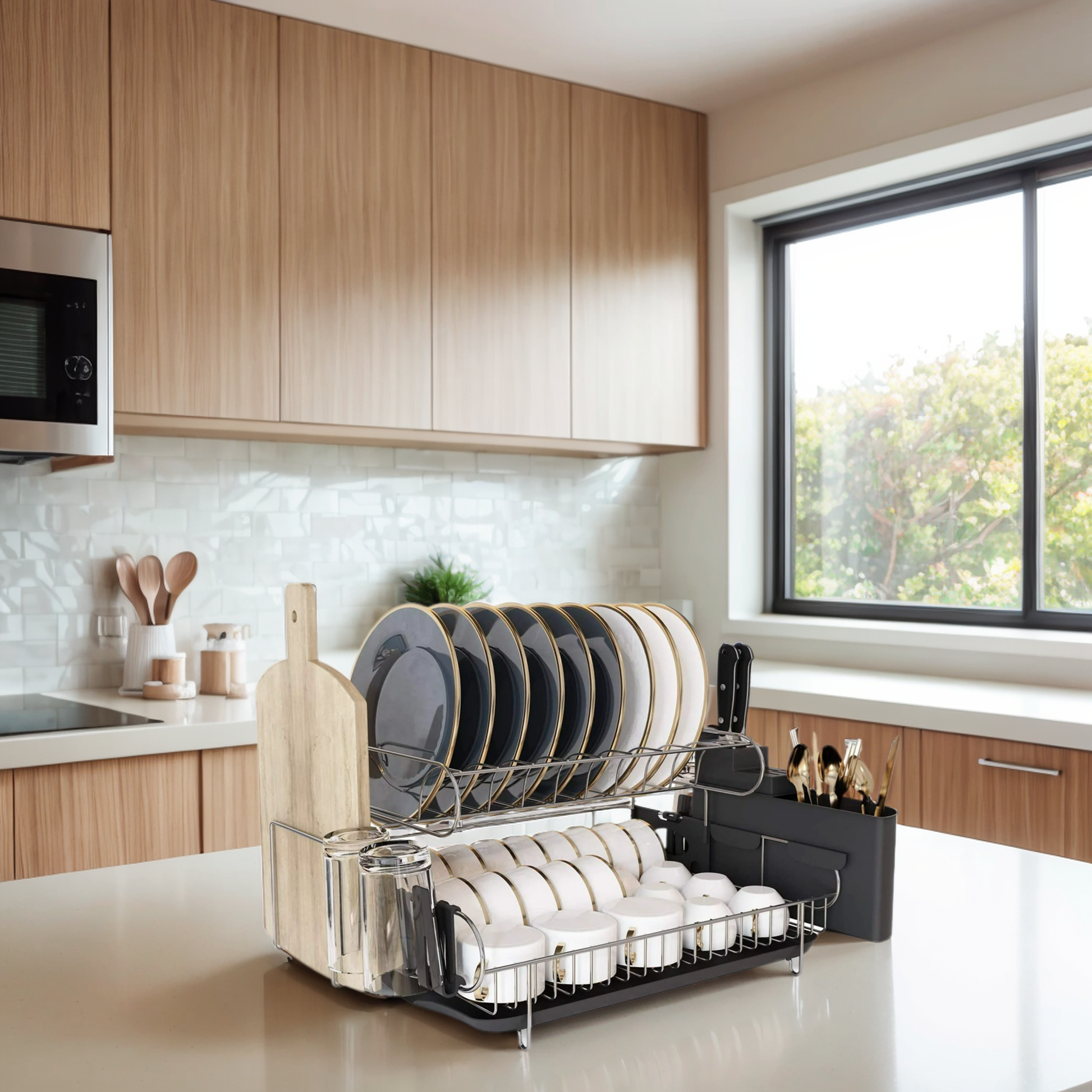 The 2 Tier Dish Drying Rack is a practical and stylish addition to any kitchen. Made from heavy-duty metal, it is built to last. The rack includes utensil holders, cup holders, knife holders, and a chopping board holder, giving you flexible storage for all your dishes and kitchen tools.