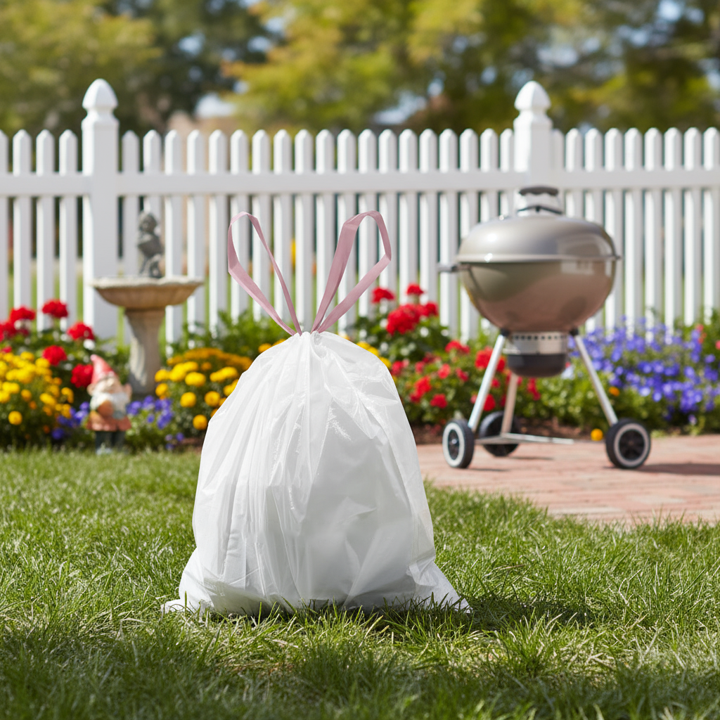 <br>The colored drawstring stretches over the rim of your trash can for a snug, secure fit, keeping the bag in place and preventing slips or spills.