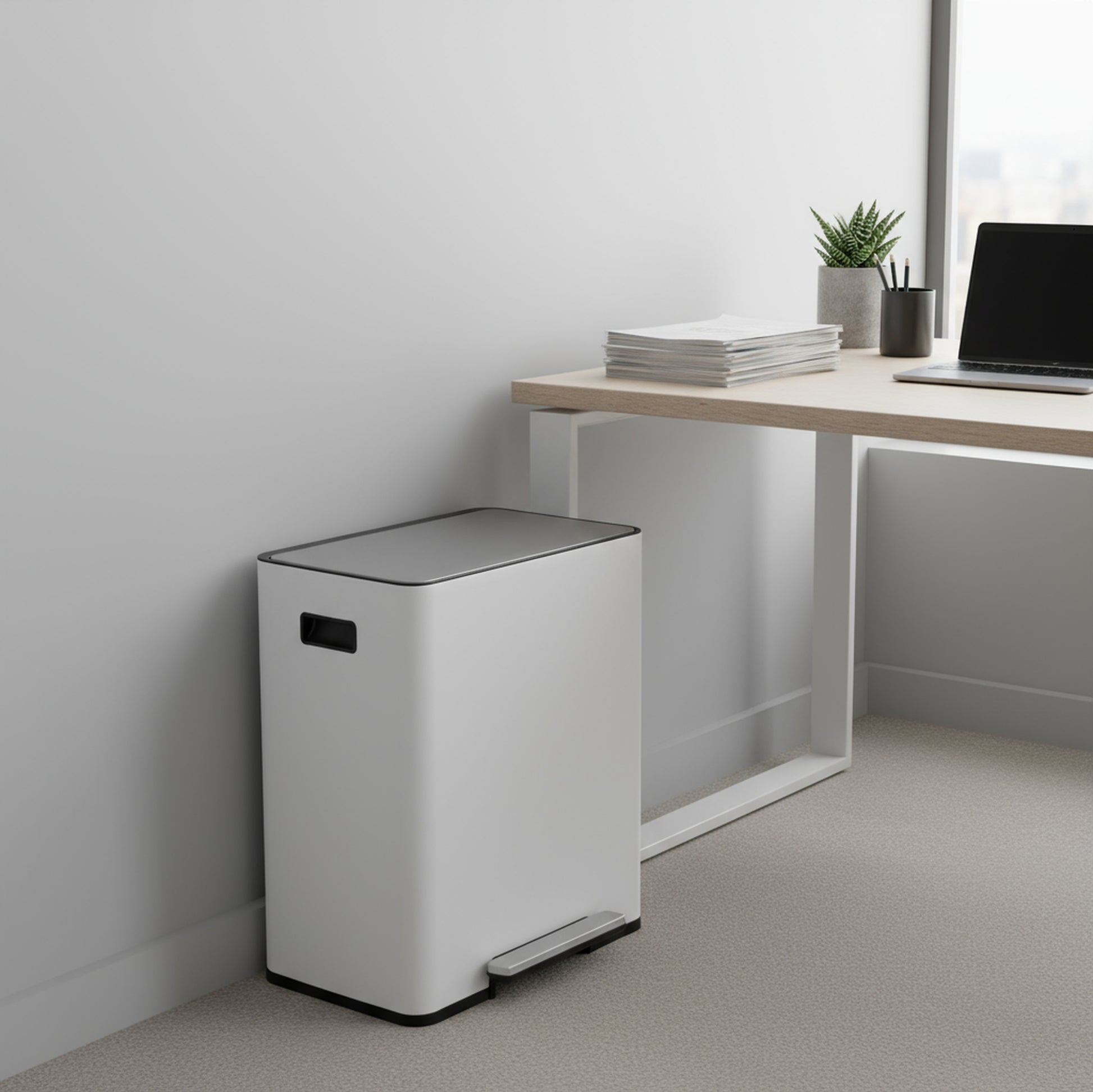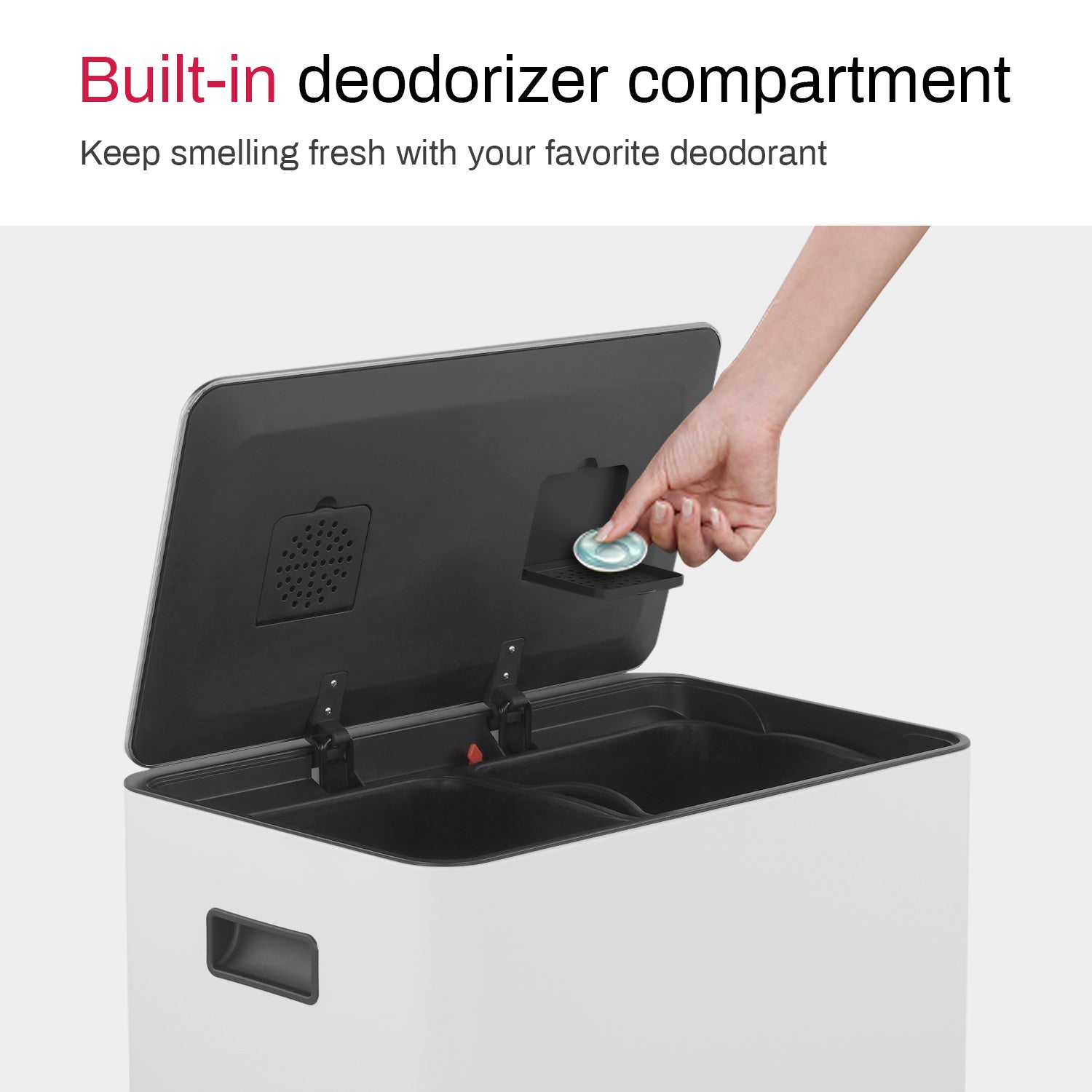 This stainless steel recycling trash can features two 8 gallon compartments, allowing you to sort trash and recyclables or separate different types of recyclables in one bin. Each compartment includes a removable plastic bucket that can be used with or without trash bags. The step-on design provides hands free operation, and the lid closes quietly and slowly. The durable foot pedal is built for long term use and responds to pressure from any angle.