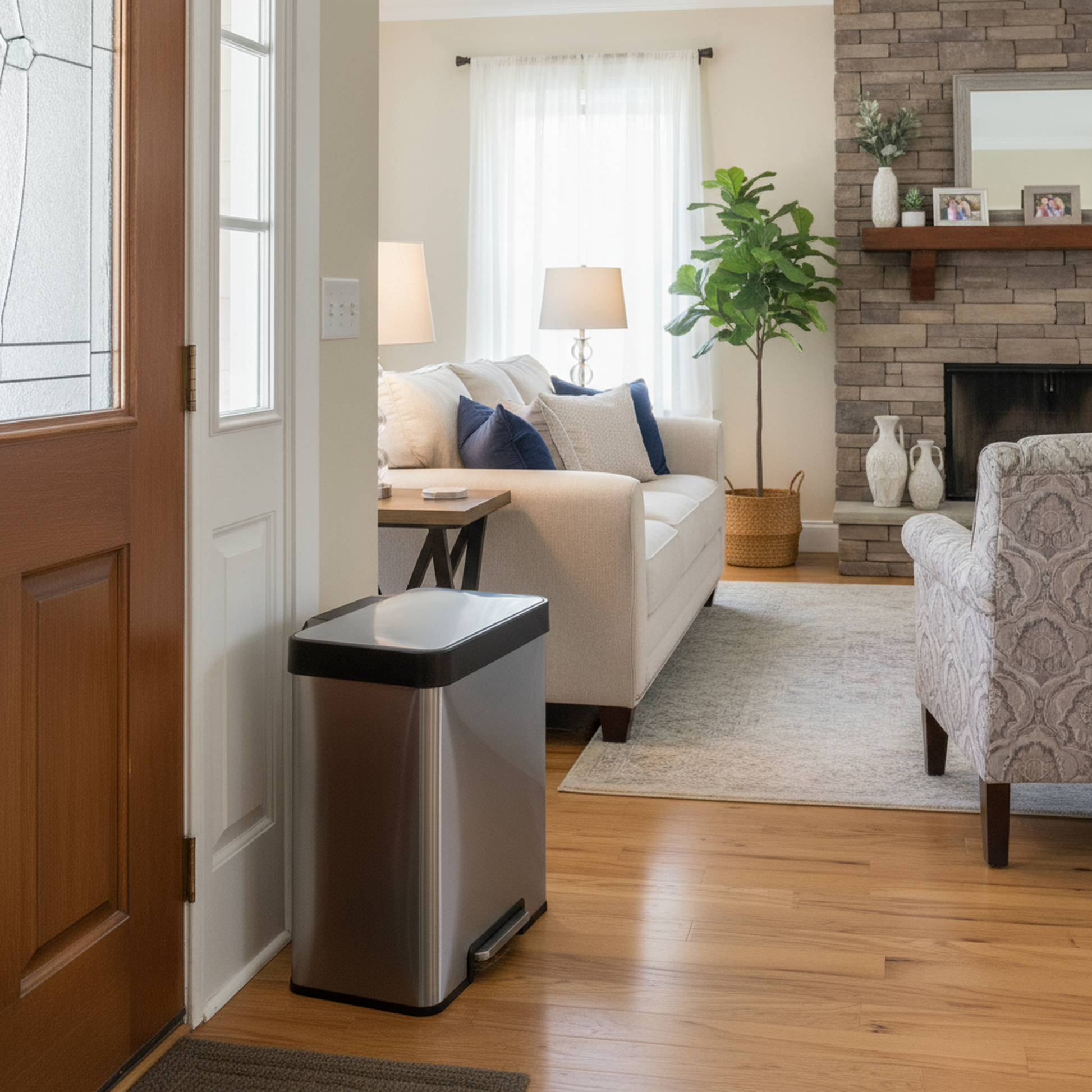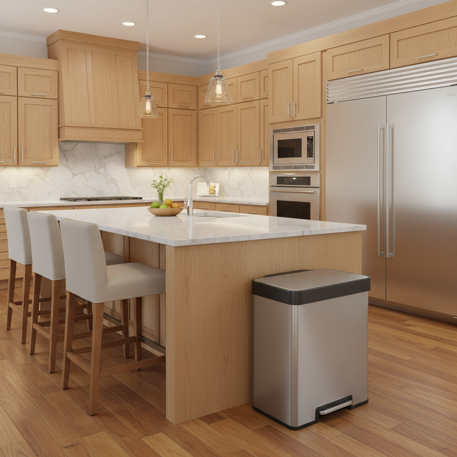 A large handle makes the trash can easy to move and lift. The lid can stay open when needed, which allows for effortless removal of trash and recyclables. The non skid base keeps the bin steady and helps protect floors from scratches. Made of brushed stainless steel with a fingerprint resistant finish, this bin is both durable and stylish.