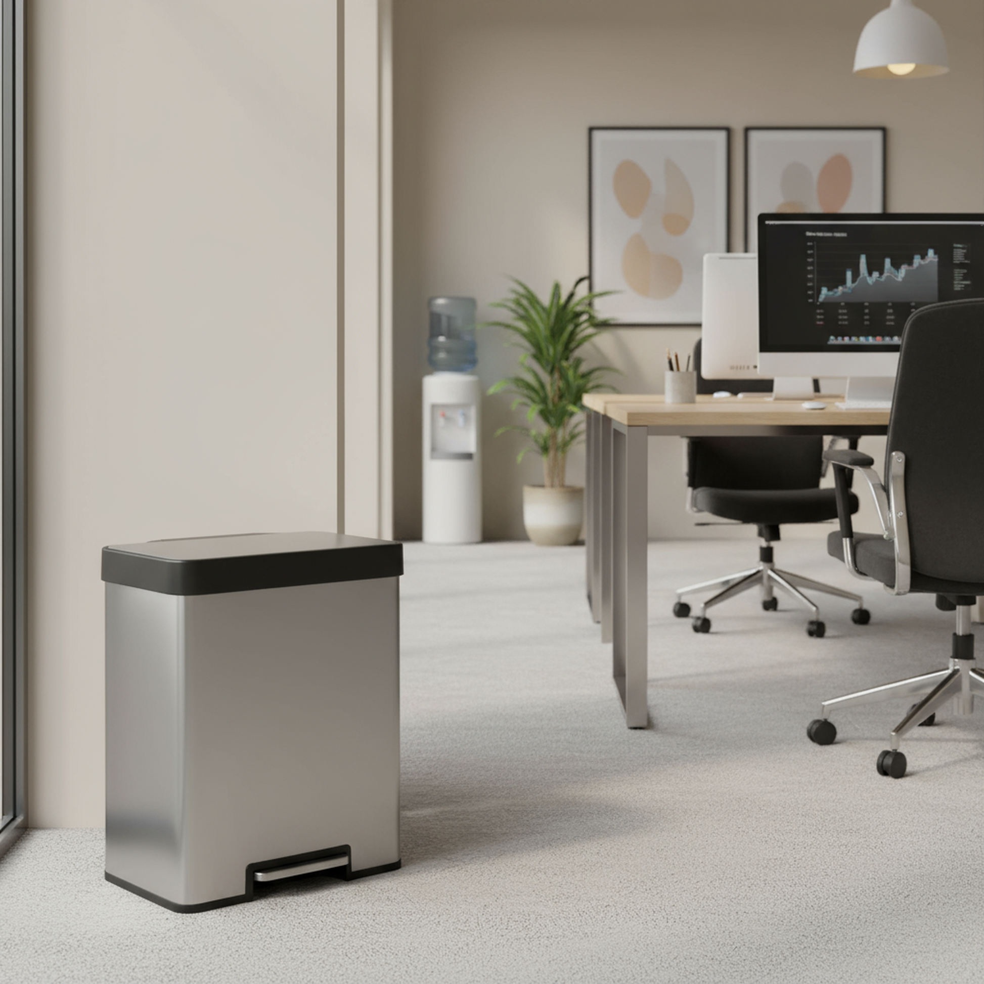 This 10.6 gallon / 40 liter stainless steel recycling trash can features two 5.3 gallon compartments, allowing you to sort trash and recyclables or separate different types of recyclables in one bin. Each compartment includes a removable plastic bucket that can be used with or without trash bags. The step-on design provides hands free operation, and the lid closes quietly and slowly. The durable foot pedal is built for long term use and responds to pressure from any angle.%3Cbr%3E