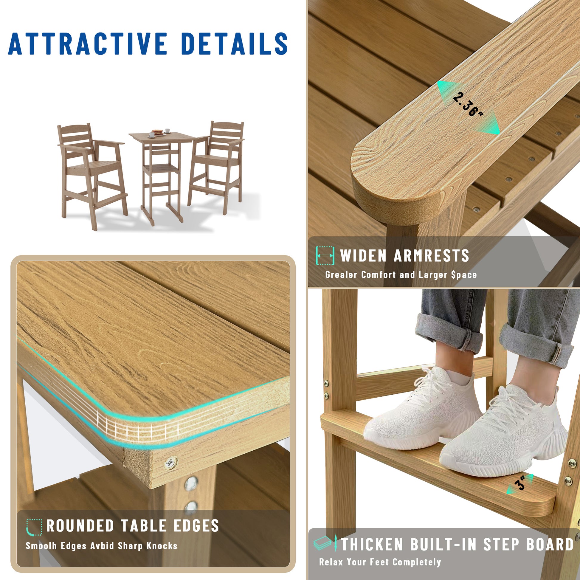 Poly Lumber Patio HIPS Bar Set, 2-Person Plastic Outdoor Bar Stools with Table, Teak Tone, 600 lb. Weight Capacity